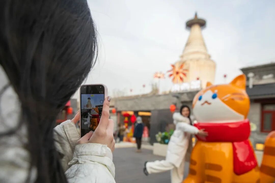 休息好了,重新出发,一路向东走就来到东西岔,以胡同中灵动的橘猫为灵感创设的艺术形象“猫 MIO”在中心广场设立主题打卡雕塑,另有8只猫装置巧妙散落于街巷角落,在昼夜交替间营造出灵动变幻的时尚游览动线,亦承载着“吉祥陪伴”的美好节庆寓意,是打卡拍照最出片的地方。