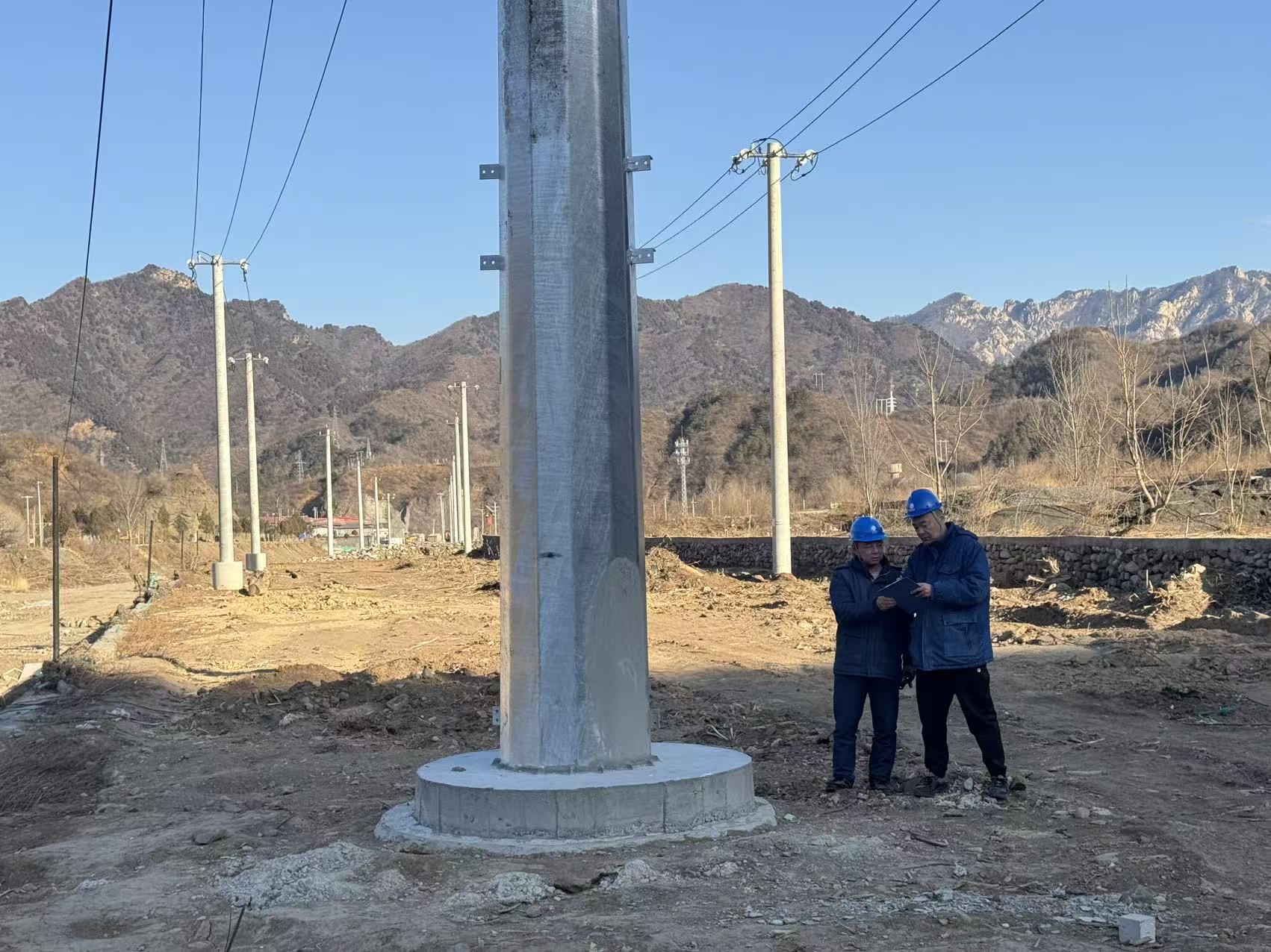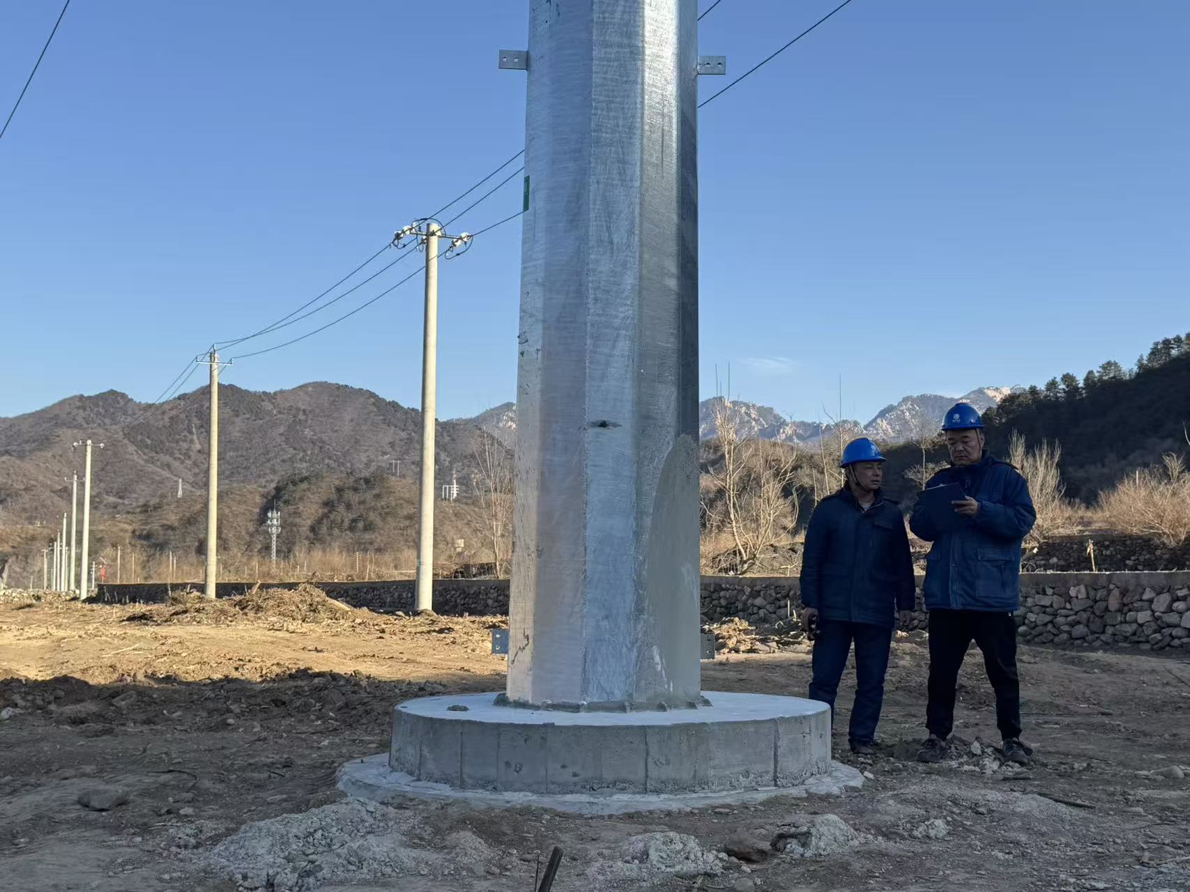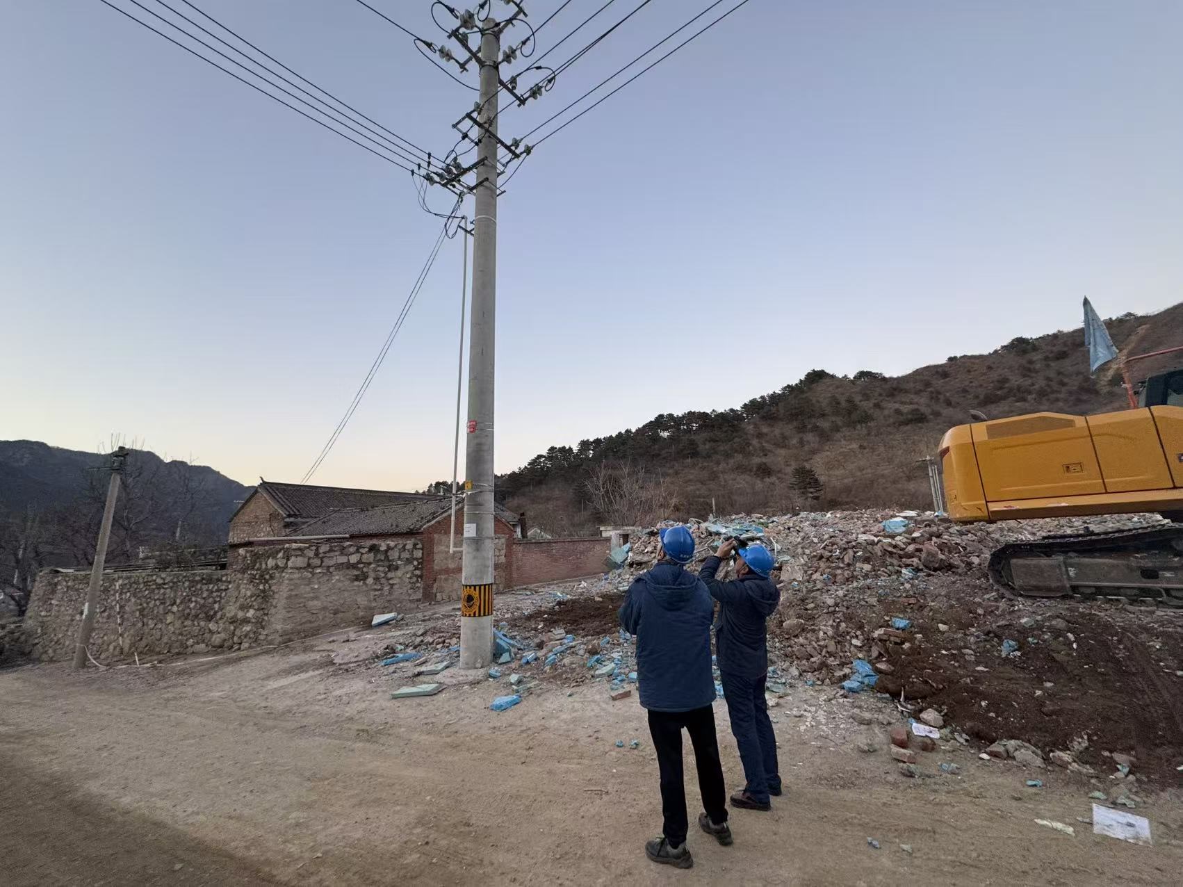 工作人员在新电线杆旁巡检