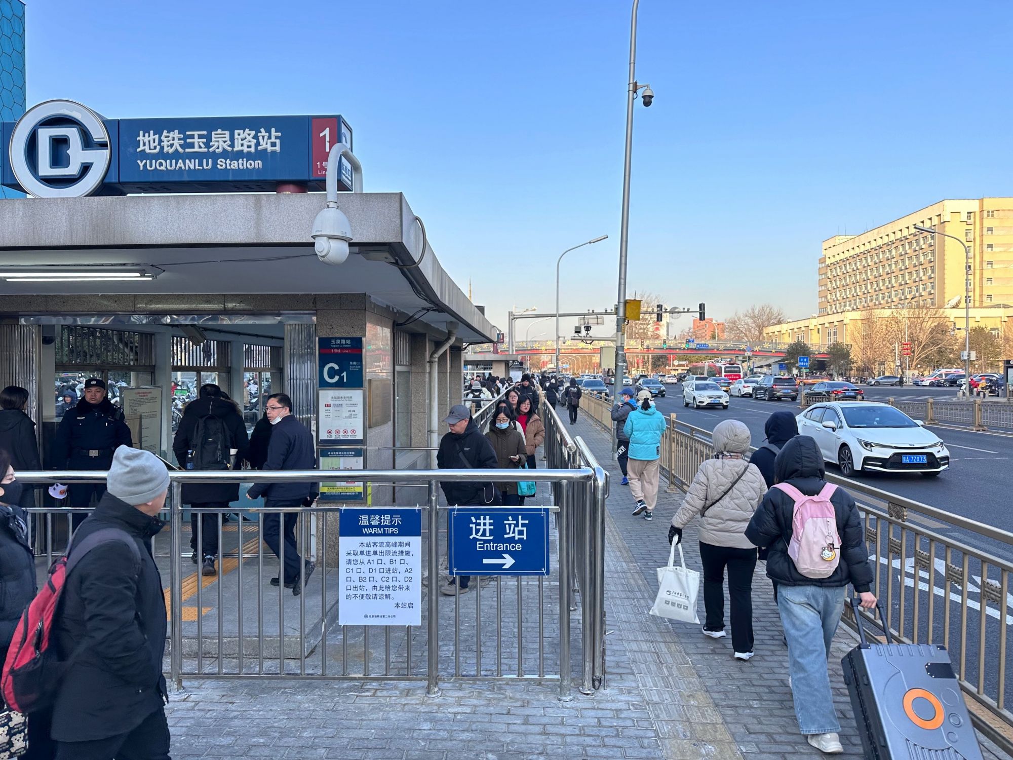 2月24日,早高峰时段,乘客在玉泉路站C1口排队进站。新京报记者 王贵彬 摄