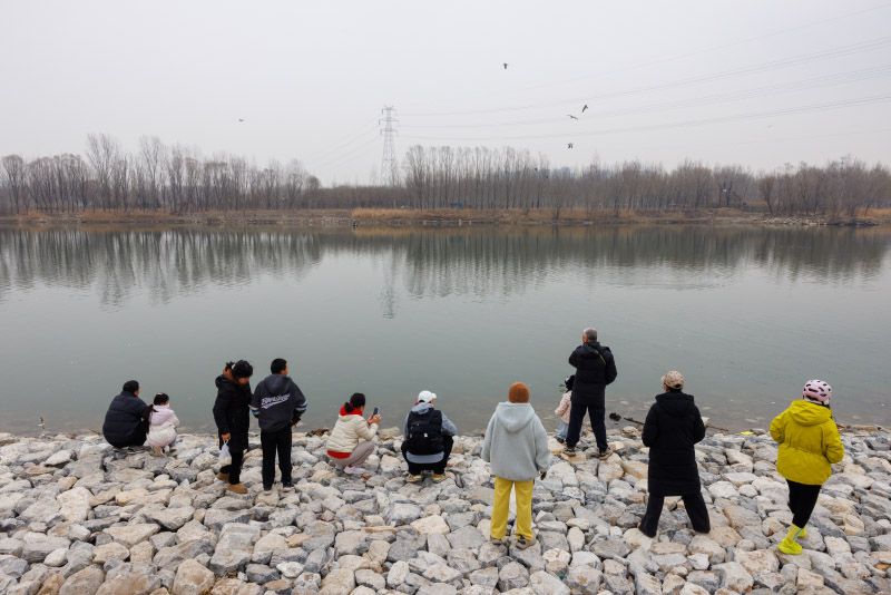 2月25日,通州区宋庄镇,市民在潮白河畔观赏西伯利亚银鸥。西伯利亚银鸥为候鸟,在路途上会选择在鱼、虾等水产资源丰富的水域补充体力。
