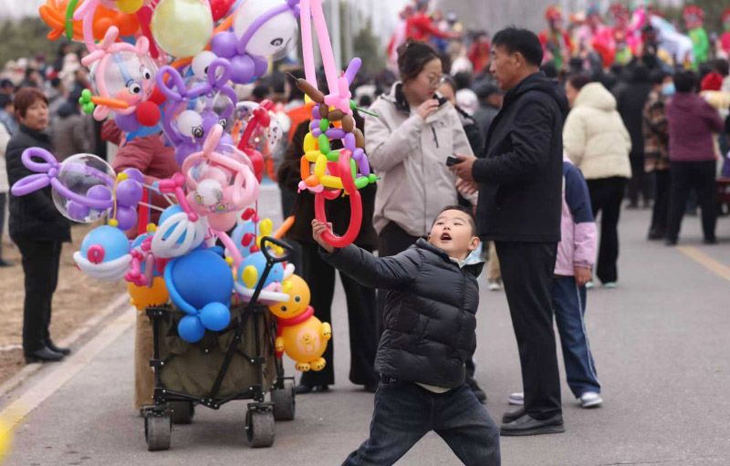 小朋友挑选气球玩具。活动专设本地农特产品展销区与传统手工技艺体验展位。