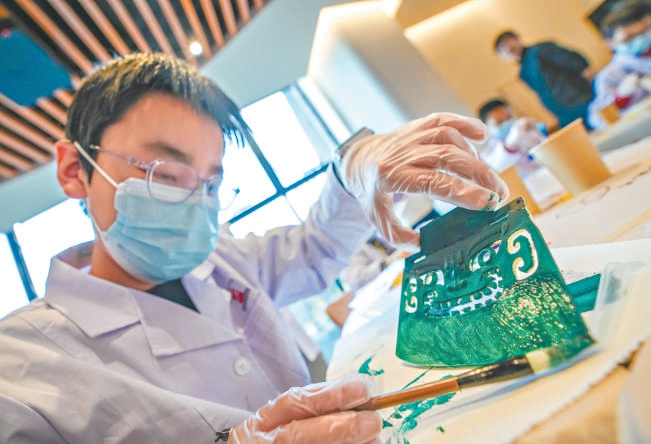 近距离观摩完文物保护中的科技和传统技艺,文保专家又带领大家来到社教培训区,体验“青铜器涂鸦”趣味实践课。在专业指导下,孩子们化身“小小修复师”,用牙刷蘸取虫胶、颜料和沙土,再用小木条拨动牙刷,给青铜器模型上色、做旧,呈现金属锈蚀的颗粒感。“原来青铜器的颜色是这样一层层做出来的!感觉‘文物’在我手中‘活’过来了。”初一学生宫书达举着自己的“作品”兴奋地说,“这项工作需要慢工出细活。我感受到了文化的传承,更体会到文物修复师的匠心精神。”