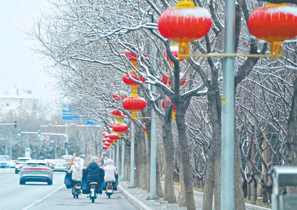 一场春雪前天夜间悄然而至,昨天清晨的京城如同披上轻纱。白雪与火红灯笼相映成趣,为春意渐生的北京添上一抹亮色。