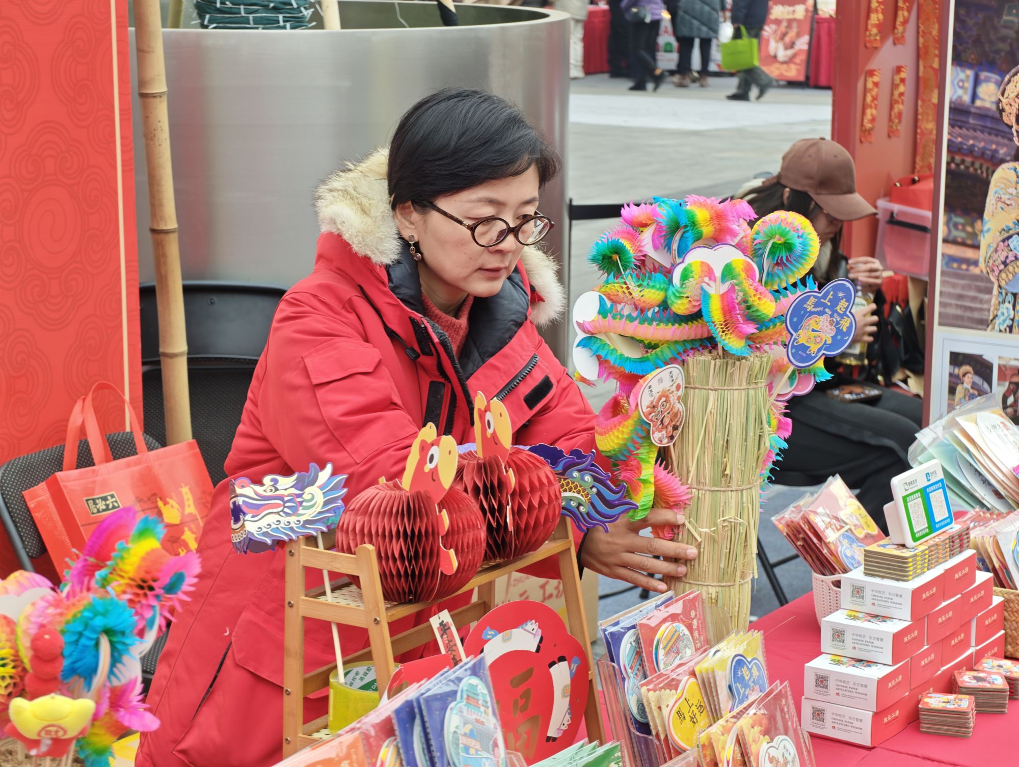 2月25日,北京隆福寺新春市集,“翻里花”非遗技艺传承人李梅正在整理摊位。新京报记者 王巍 摄