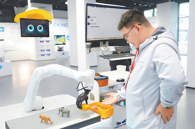 在雄安人工智能产业园展厅内,具身智能“眼脑手”机器人正在演示。实习记者 常一鸣摄