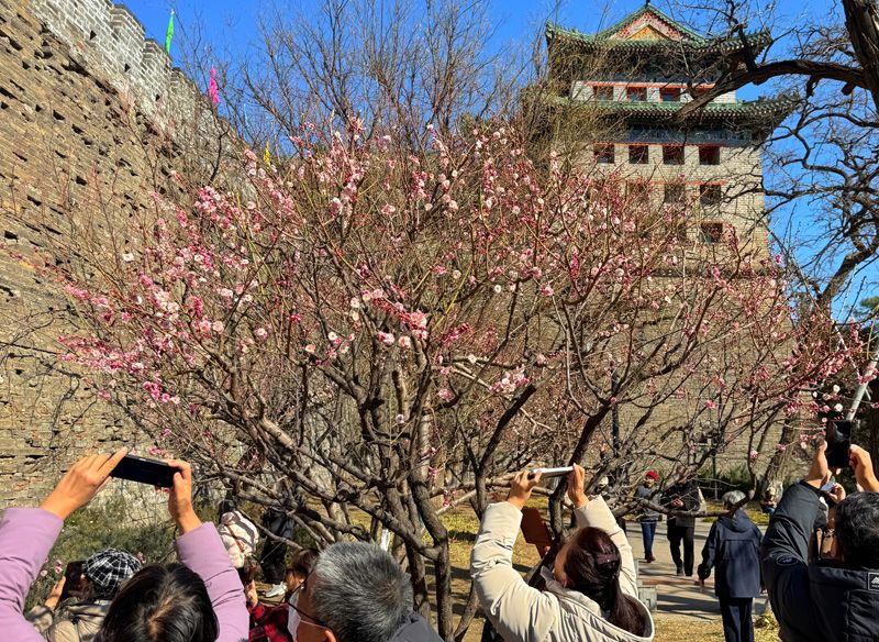 明城墙遗址公园,众多游客在树下赏梅、拍照。