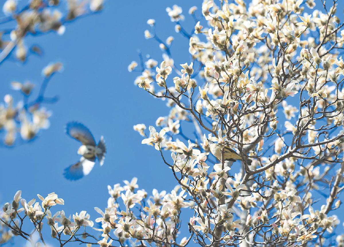 场景:蓝天下,盛开的玉兰花和翱翔的鸟儿。