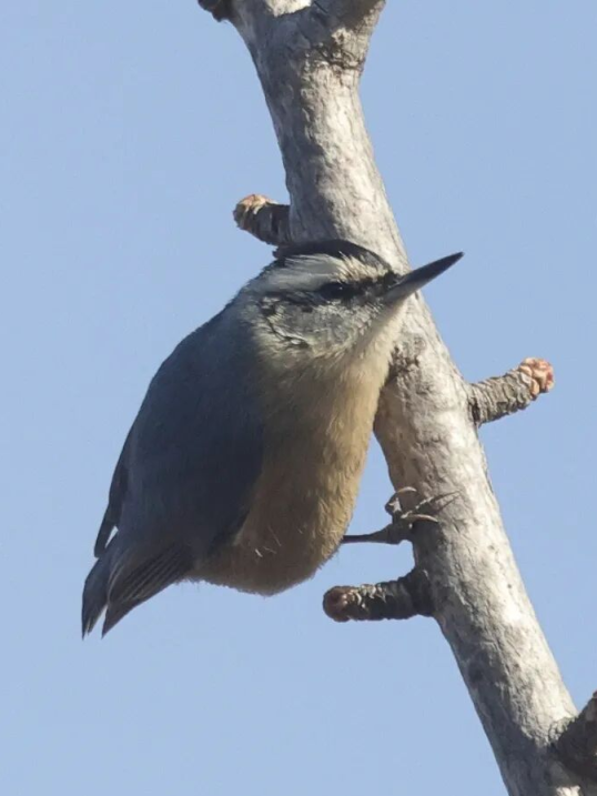 取食时,它会抓紧树枝,将喙探进树皮缝隙中挑剔或撬取隐藏的食物,整个过程几乎不伤树皮!更厉害的是,它是少数能倒挂在树干上“干饭”的鸟,可谓“心灵嘴巧”。