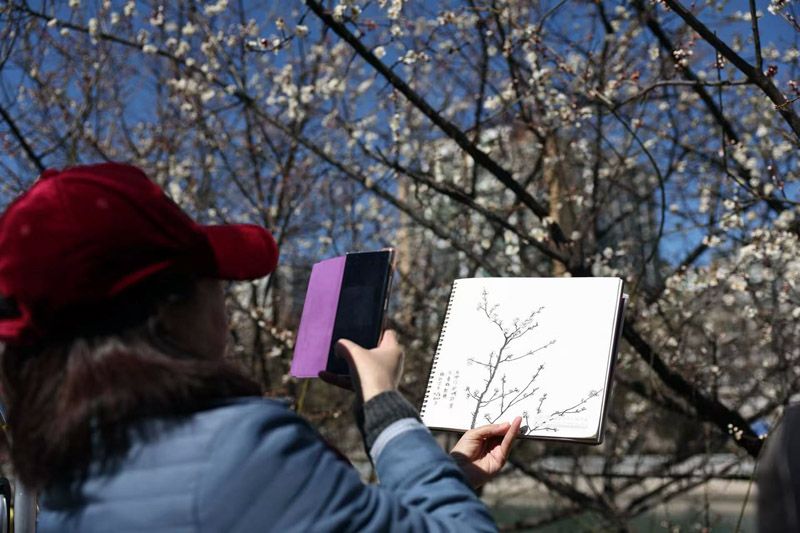 市民拍摄刚完成的山桃写生。