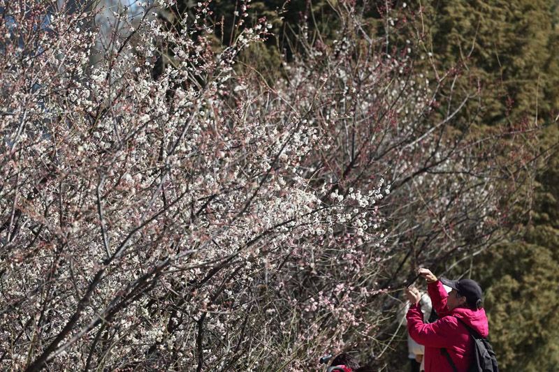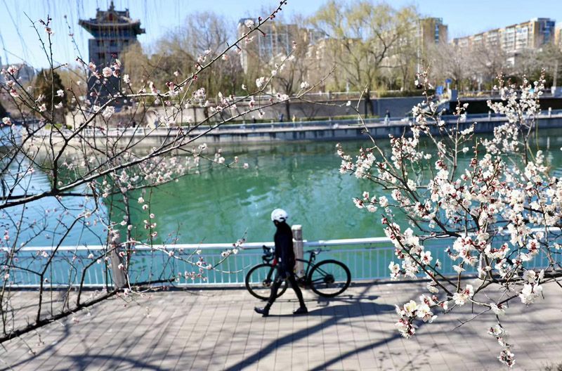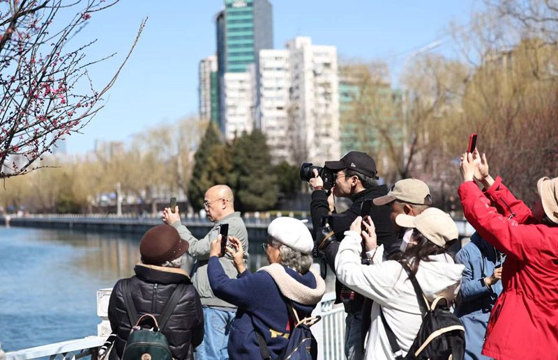 3月11日,位于北京左安门角楼周边的山桃已经绽放,吸引不少市民前来拍照打卡。