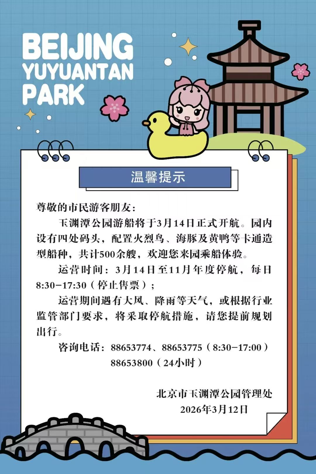 据了解,公园共有50公顷的通航水域,游船运营时间为每天8:30到17:30止票。为了确保游客安全,根据气象部门的实时通知,遇4级或4级以上大风,公园游船将停航。玉渊潭公园将会在官方微博及时发布停航信息,请广大游客市民及时关注,合理安排出行。