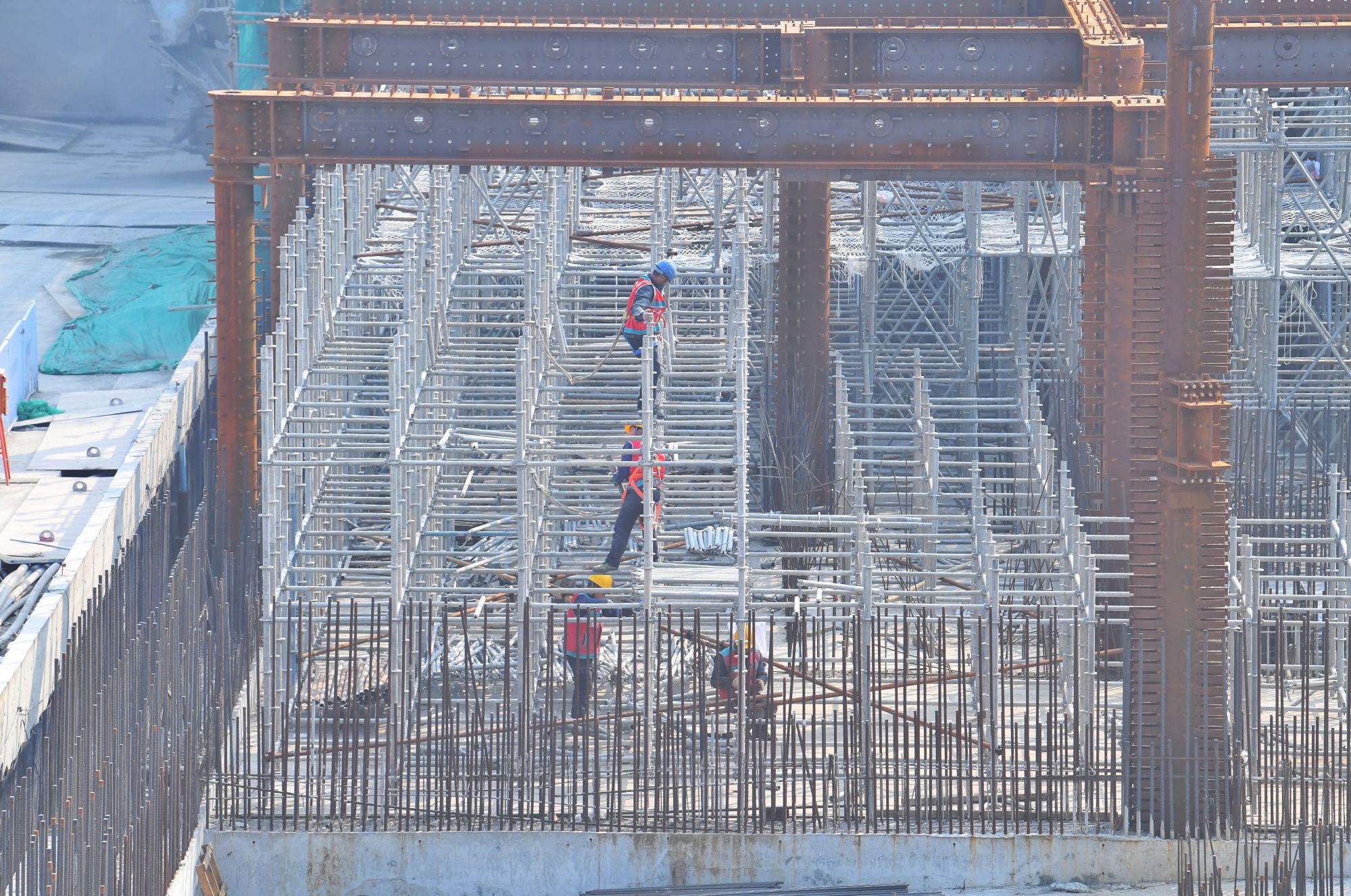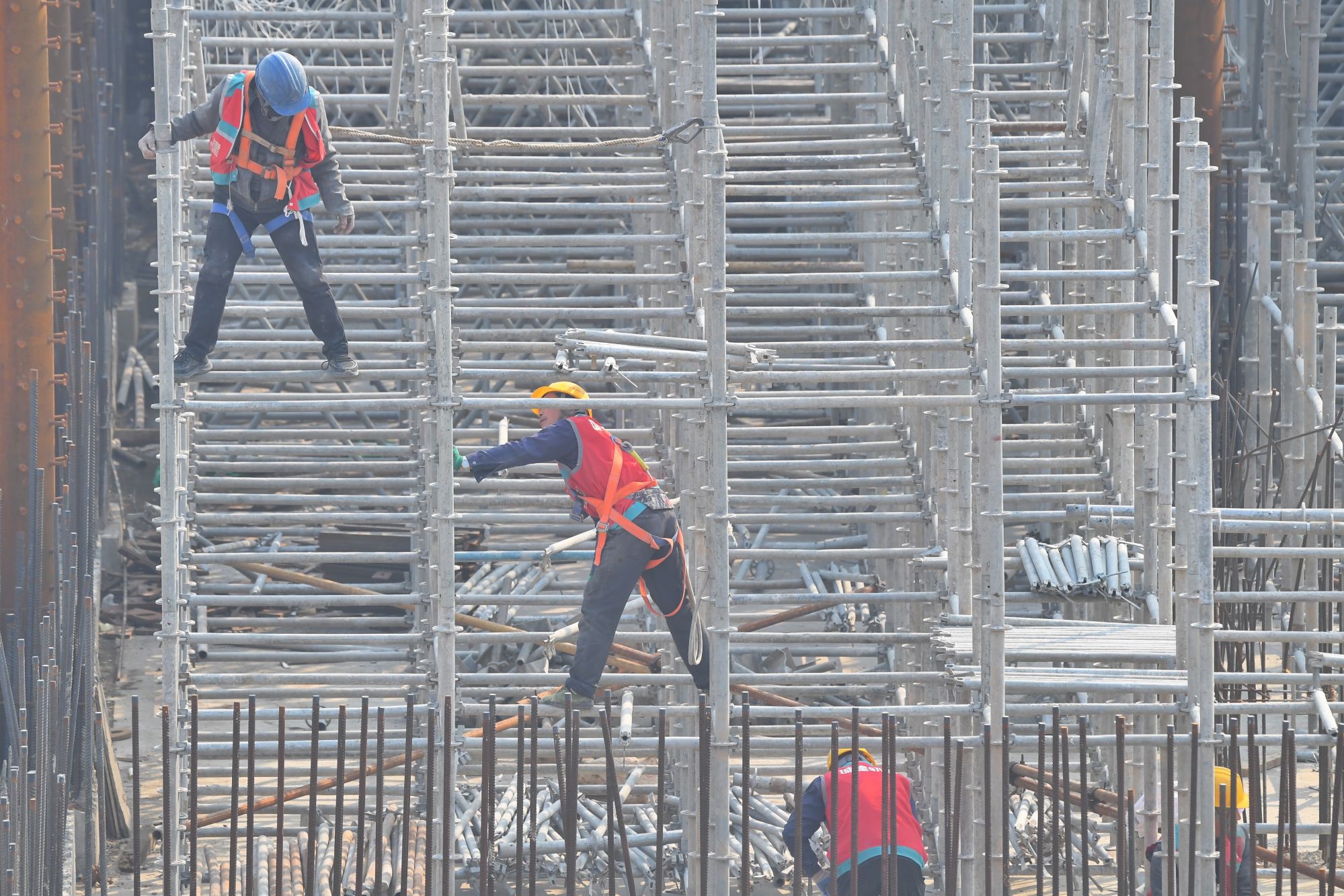 工人在脚手架间穿梭忙碌。新京报记者 王贵彬 摄