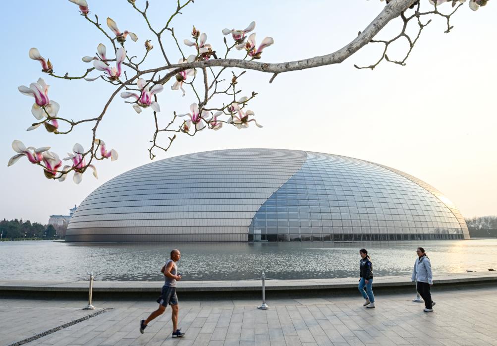 3月12日,市民从国家大剧院旁的玉兰树下经过。新华社记者 陈晔华 摄