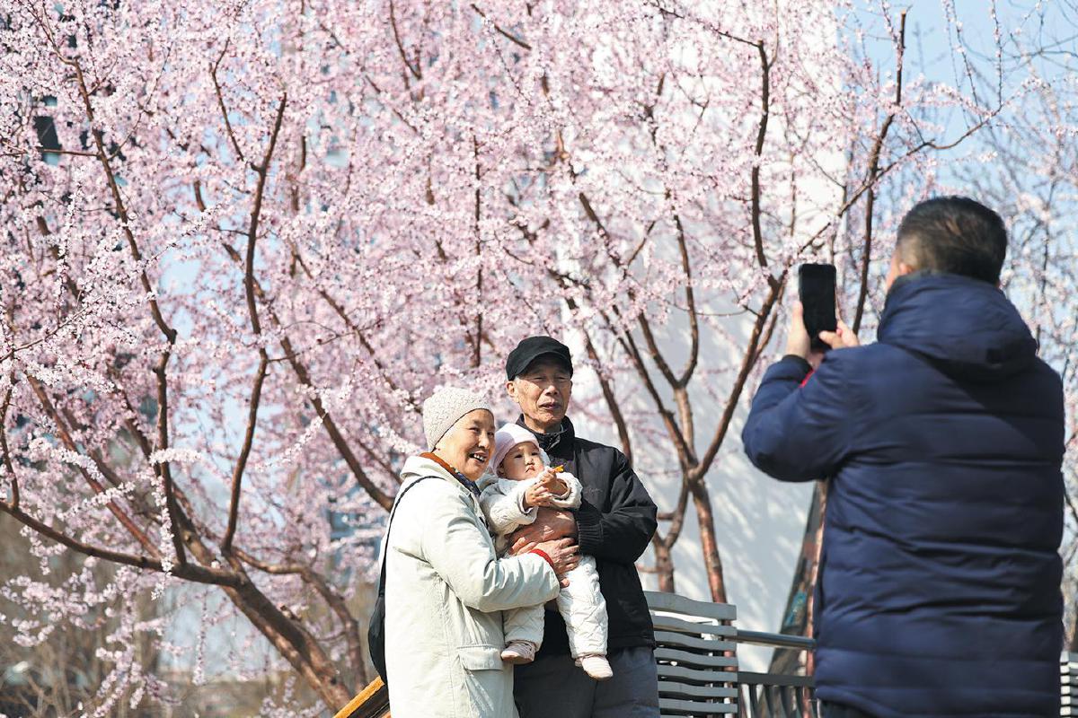 场景:河岸边山桃盛开,吸引不少市民前来赏花。新京报记者 王飞 摄