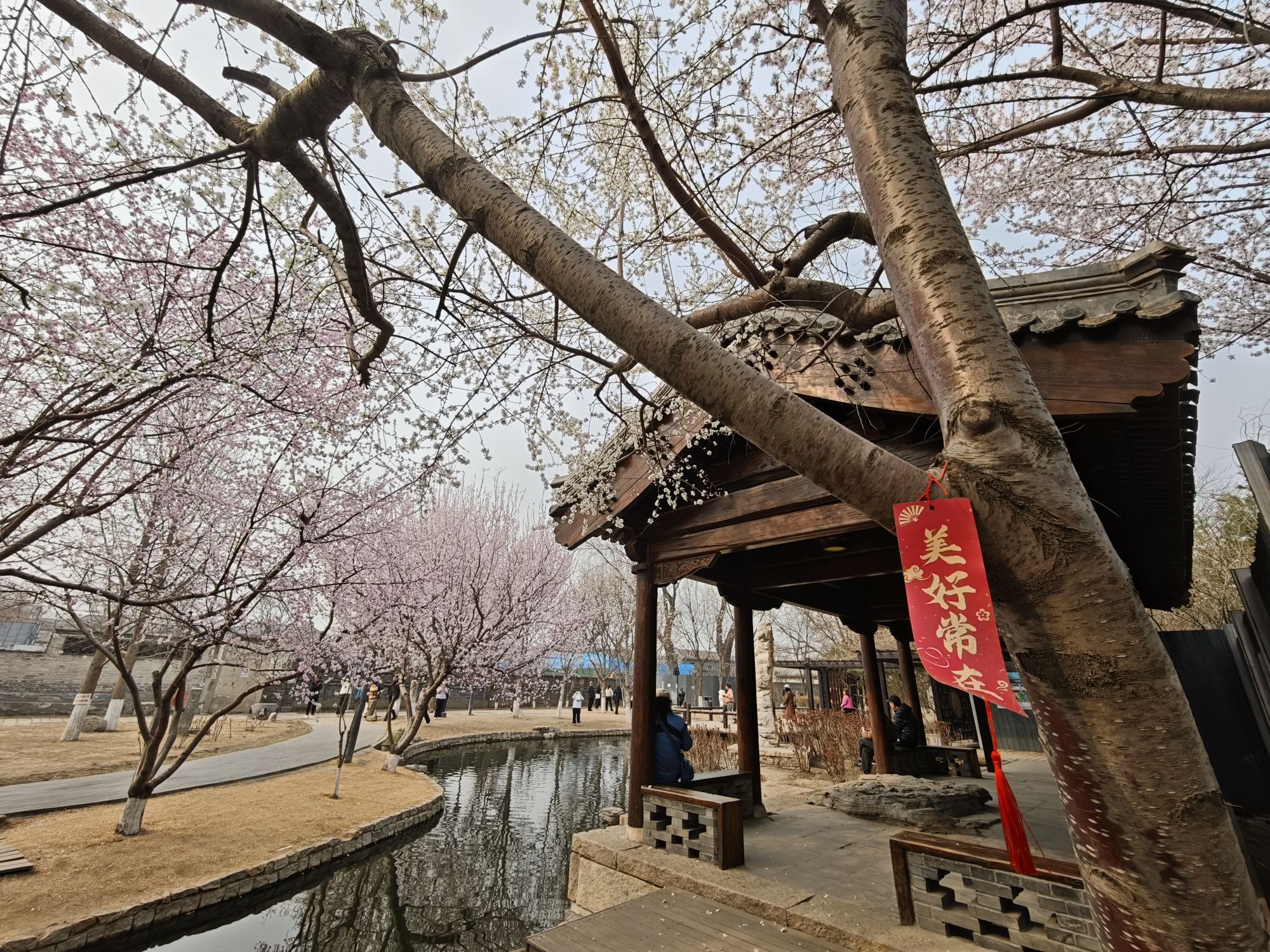 三里河公园距离前门大街约1公里,顺着前门大街穿过胡同溜溜达达就到了。三里河公园小巧玲珑,青砖灰瓦的四合院旁水流潺潺,不时有小鸭子游过。水岸两旁便是粉色云霞般的桃花,粗大的树枝上一簇簇、一团团的花朵娇媚动人。早上9点半,游客不算多,水岸边一家书社将一把把露营椅搬出来,放在桃花树下,一阵轻风吹过,花朵扑扑簌簌地落下粉色花瓣儿。
