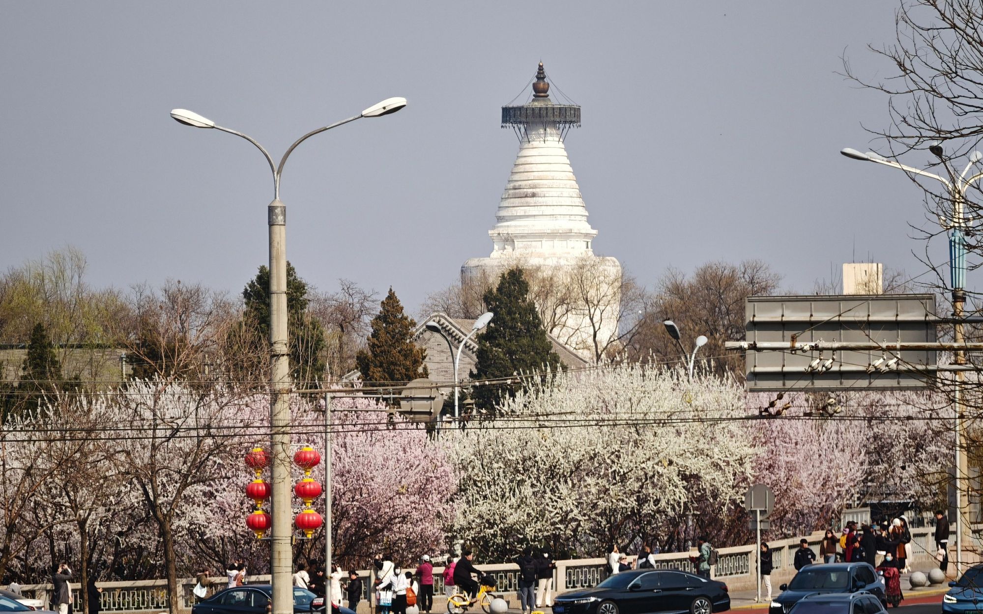阜成门桥旁的山桃已悄然进入盛花期,粉白花瓣缀满枝头,与不远处的妙应寺白塔相映成趣,再搭配桥下车流不息的都市景致,构成一幅古今交融的春日画卷。这一“桃花映白塔”的独特景观迅速走红社交平台,成为市民游客争相打卡的网红赏花点。