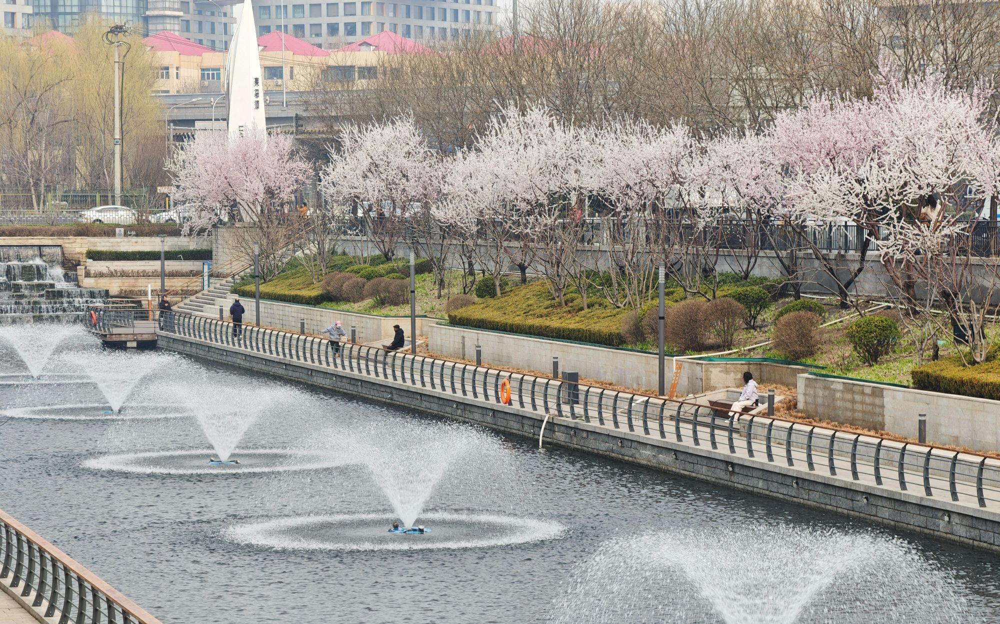 北京城区最著名的河道亮马河,在春日里更加粉雕玉琢,嫩黄的柳丝与粉艳的桃花交相辉映。山桃率先吐蕊,粉白花瓣轻缀枝头;碧桃紧随其后,层层叠叠的嫣红花簇,为河岸晕染出一抹浓淡相宜的春色。