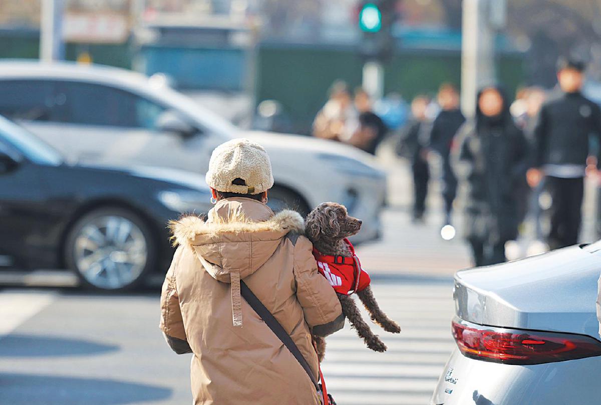 场景:一位市民抱着小狗等待过马路。新京报记者王贵彬 摄