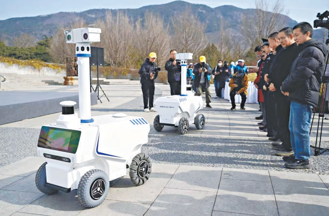 在国家植物园(北园)万生苑温室广场前,智能机器人正在巡逻,对发现的不文明行为进行友情提示和管控。 北京日报记者 程功摄