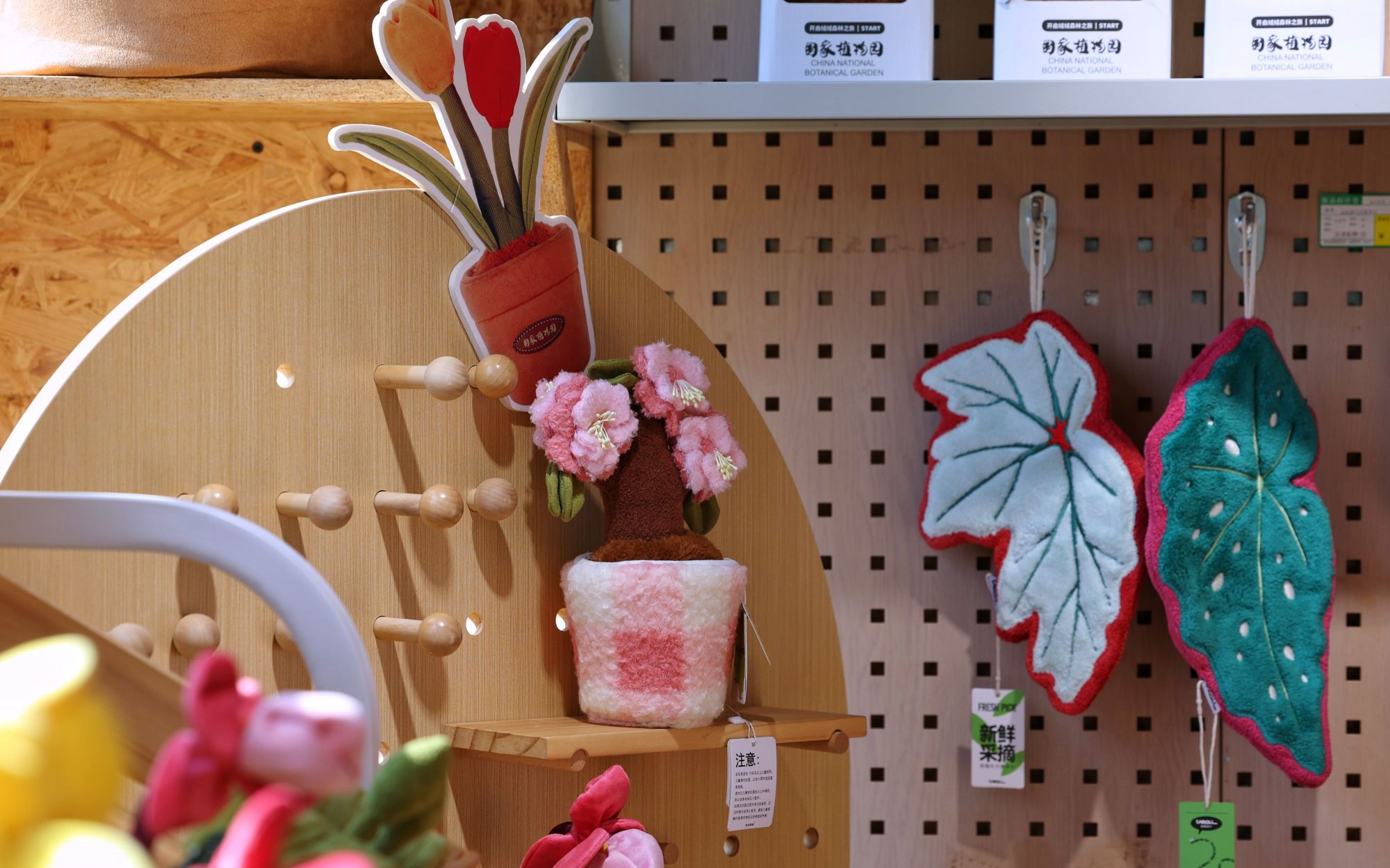3月20日,国家植物园(北园),山桃花系列文创产品热卖。新京报记者 薛珺 摄