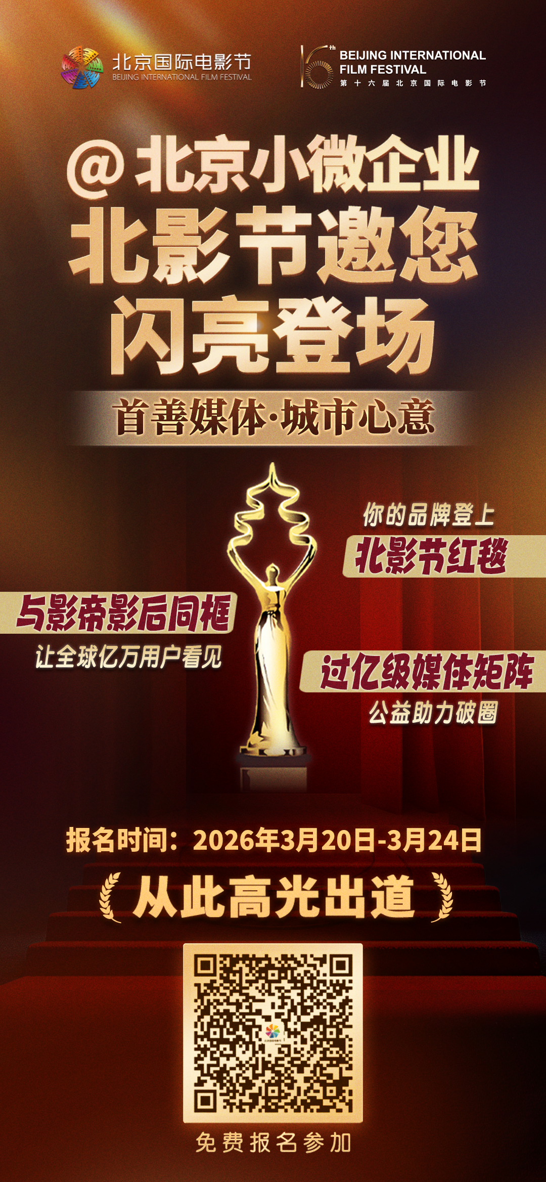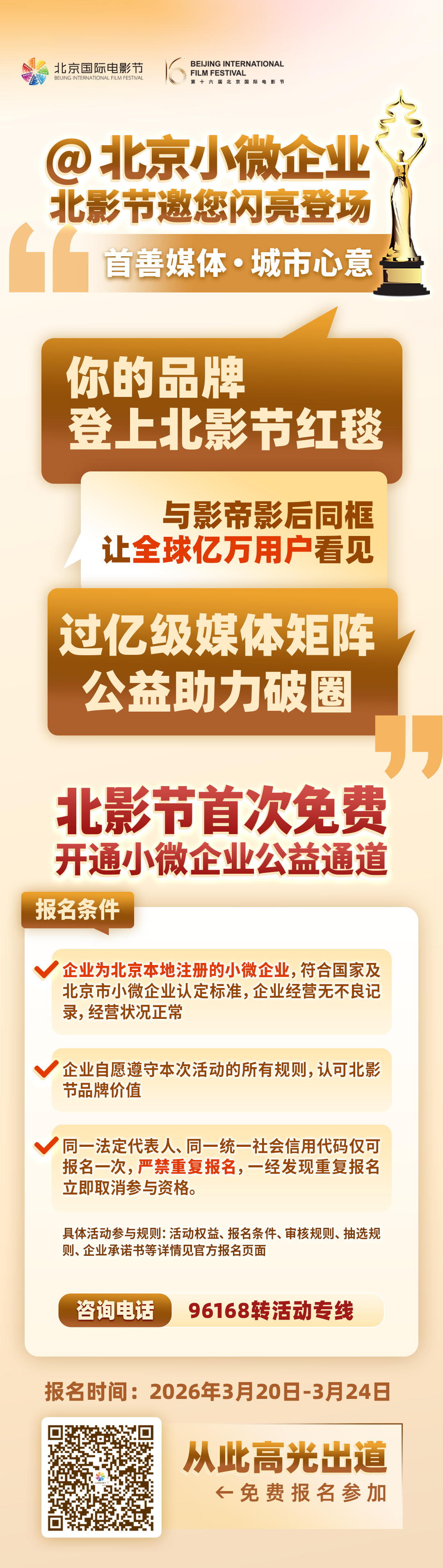 【北京国际电影节专属公益活动助力小微企业发展】随机抽选16家小微企业,中选即可享红毯星光、专属宣传片大小屏轮播、公益直播、官方身份授权等权益。报名时间:3月20日-3月24日,扫码报名获取详情~ (本次活动为公益性质,主办方不收取任何费用)