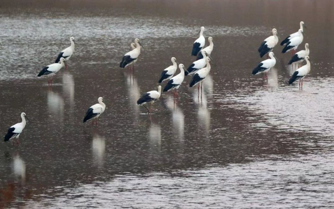 近日,国家一级保护动物东方白鹳成群现身官厅水库,数量达到51只,创下北京黑豹野生动物保护站26年来在此地监测到的最高纪录。新京报记者 李木易 通讯员 李理 摄