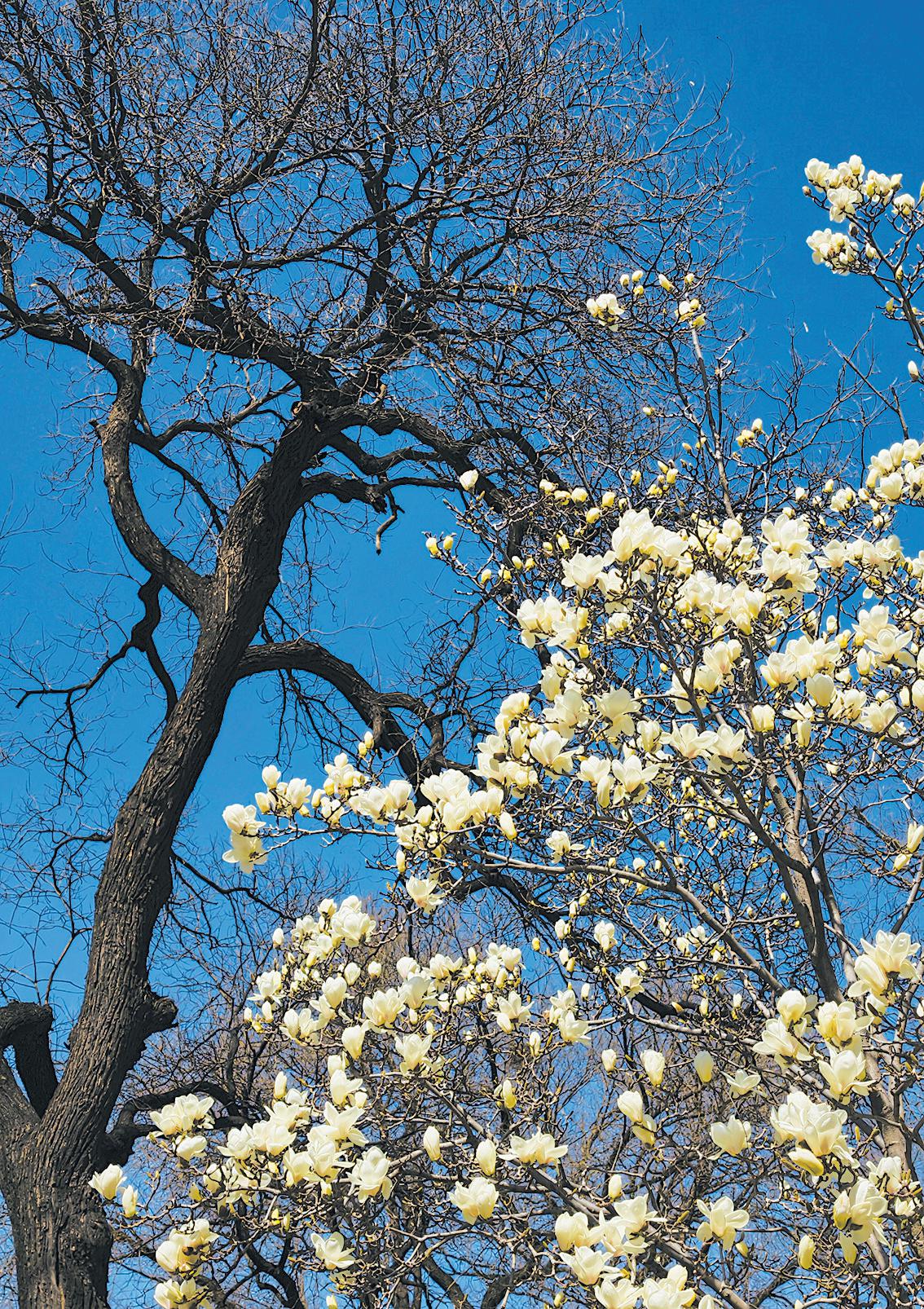 场景:盛开的玉兰和远处的古树同框。 新京报记者 浦峰 摄
