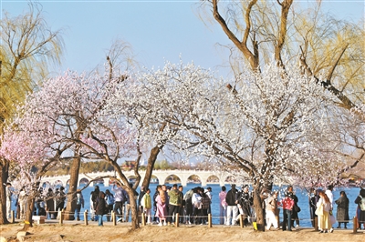 3月的京城春意渐浓,颐和园西堤的山桃迎来盛花期,粉白花枝与碧水、红墙交相辉映,吸引大批市民前来踏青赏花。随着气温稳步回升,颐和园春日花事将接连绽放。山桃花期过后,碧桃、西府海棠等将陆续开放,赏花期可延续至4月中下旬。