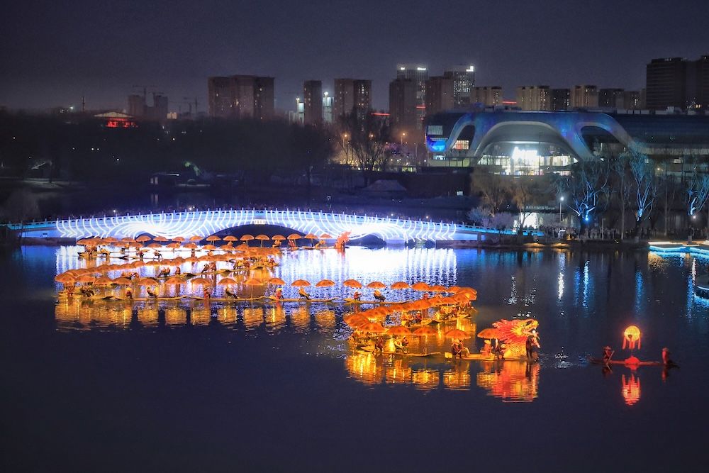 亮马河两岸灯火与发光“金龙”相互映衬,夜色流光溢彩。