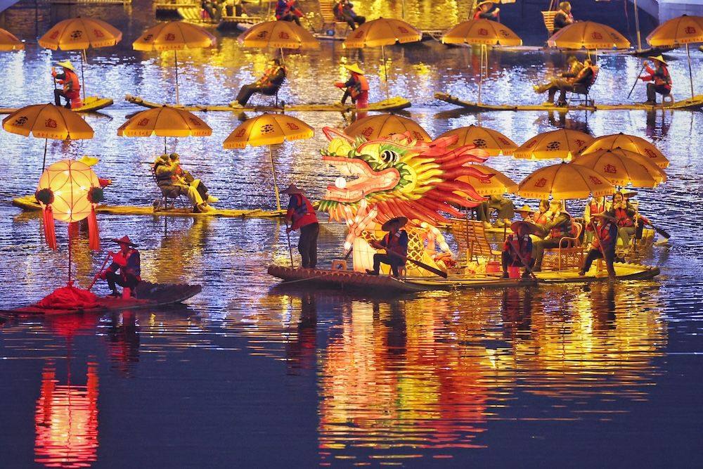 桂林阳朔“金龙”白天进行彩排。