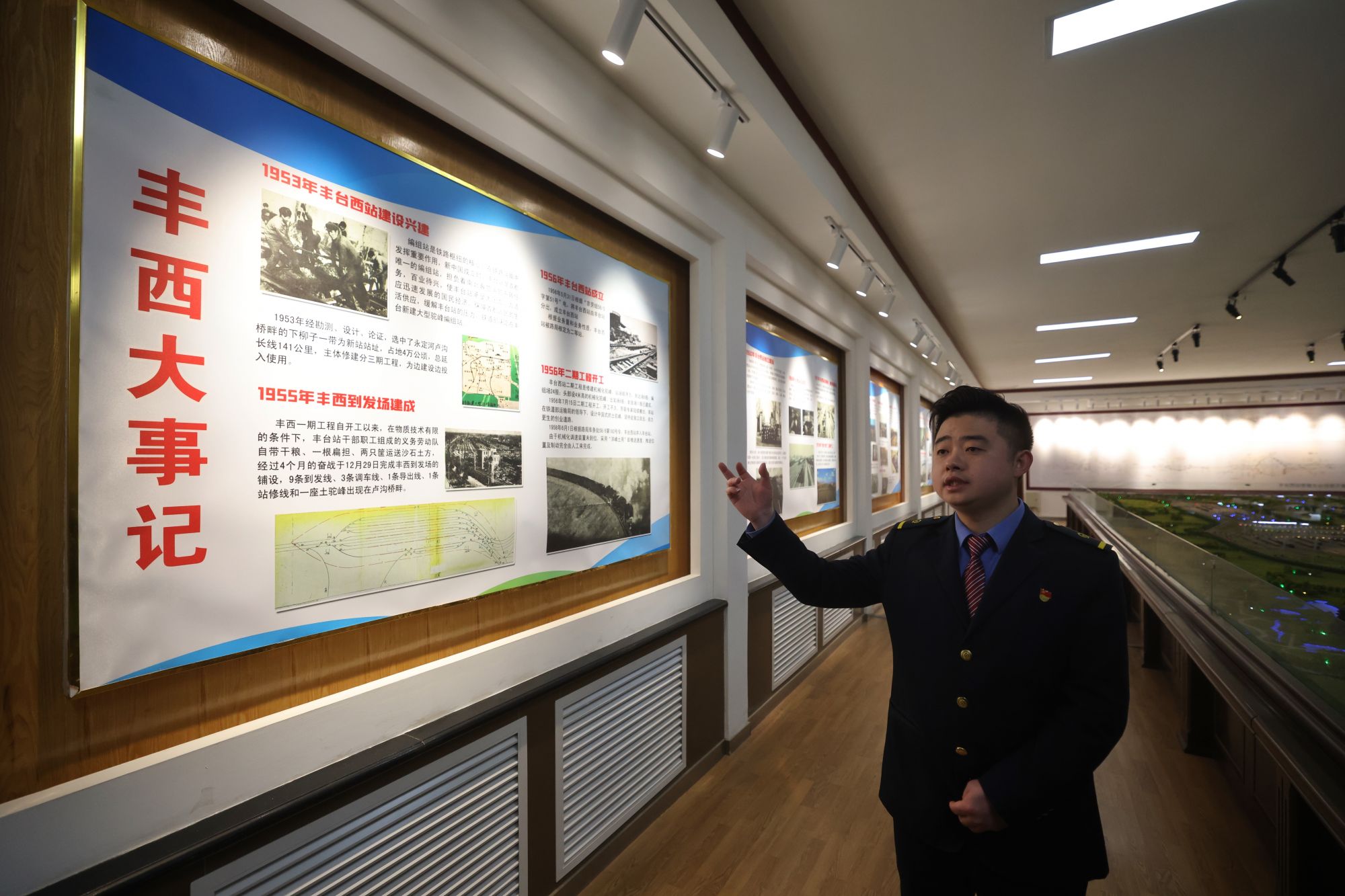 在丰台西站站史馆,车站职工介绍丰台西站基本情况、发展历程。新京报记者 王贵彬 摄