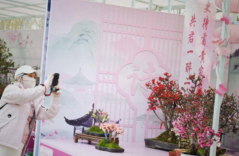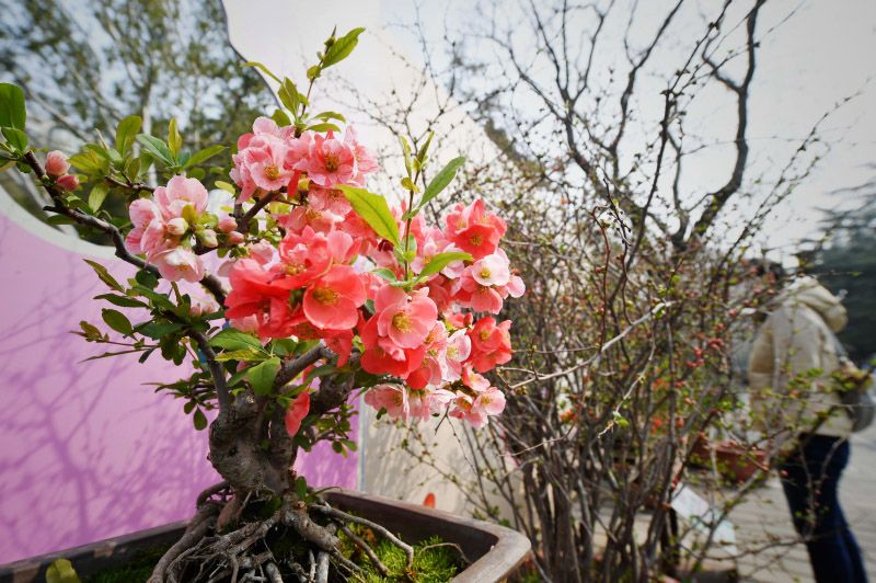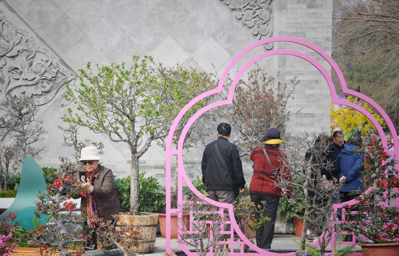 游客拍摄海棠盆景。
