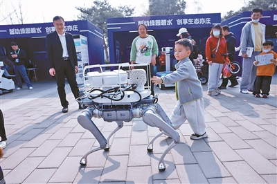 清扫机器人有条不紊地打扫卫生;机器狗穿梭其间,负责巡逻检查与定点值守;生态巡护机器人依托自主导航与语音交互,执行巡逻、设备巡检、生物监测等任务;割草机器人则在草坪上有序作业。展位上,AI节水机器人、智慧养护免浇灌花箱、智能虫情性诱测报仪等设备吸引市民驻足了解;水面清洁无人船在湖面巡游搜集垃圾,飞行救生圈与水下救援探测船则为应急救援提供实时保障。在游客休息区,服务机器人承担智能接待与答疑解惑的任务,无人售卖车提供雪糕、饮品等售卖服务……各类机器人在南海子公园联动协作,勾勒出科技应用的智慧画卷。