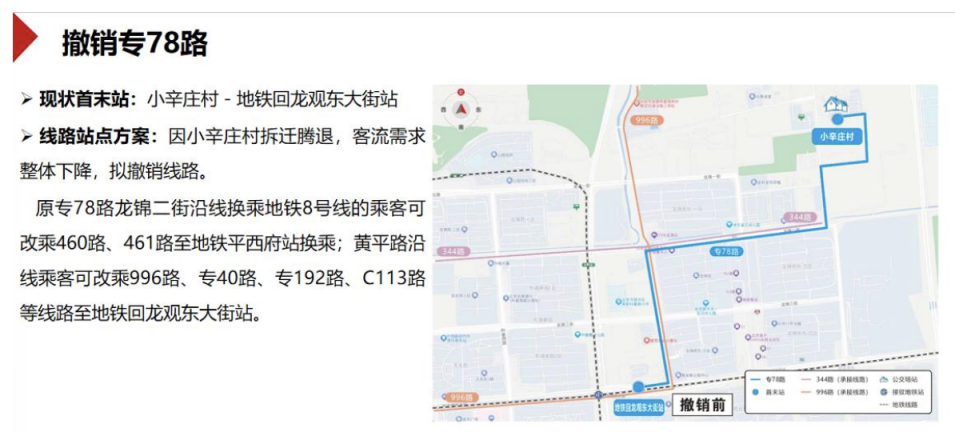 此外,因小辛庄村拆迁腾退,客流需求整体下降,拟撤销专78路(首末站为小辛庄村至地铁回龙观东大街站)。原专78路龙锦二街沿线换乘地铁8号线的乘客可改乘460路、461路至地铁平西府站换乘;黄平路沿线乘客可改乘996路、专40路、专192路、C113路等线路至地铁回龙观东大街站。