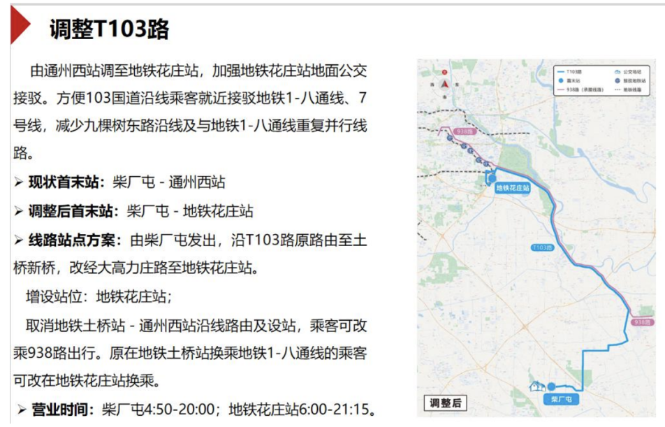 为了方便103国道沿线乘客就近接驳地铁1号线-八通线、7号线,拟调整T103路,线路由通州西站调至地铁花庄站,加强地铁花庄站地面公交接驳,同时减少九棵树东路沿线及与地铁1号线-八通线重复并行线路。线路由柴厂屯发出,沿T103路原路线至土桥新桥,改经大高力庄路至地铁花庄站。