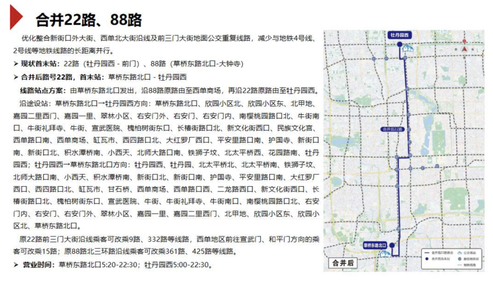 除了方便地铁接驳,优化整合重复线路、提升运营效率,也是近两年本市公交线网调整的重要方面。此次调整中,拟合并22路、88路,优化整合新街口外大街、西单北大街沿线及前三门大街地面公交重复线路,减少与地铁4号线、2号线等地铁线路的长距离并行。合并后路号22路。线路由草桥东路北口发出,沿88路原路由至西单商场,再沿22路原路由至牡丹园西。