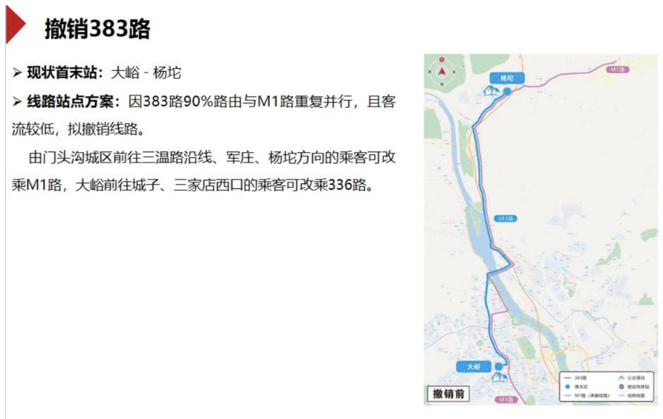 该方案还涉及两条公交线路的撤销。其中,383路(首末站为大峪至杨坨)90%路线与M1路重复并行,且客流较低,拟撤销线路。由门头沟城区前往三温路沿线、军庄、杨坨方向的乘客可改乘M1路,大峪前往城子、三家店西口的乘客可改乘336路。
