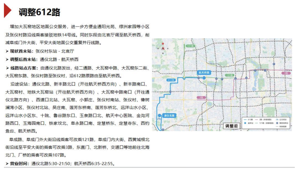 此外,拟调整612路,增加大瓦窑地区地面公交服务,进一步方便金通阳光苑、绿洲家园等小区及张仪村路沿线乘客接驳地铁14号线。同时,线路东段由北官厅调至航天桥西,削减阜成门外大街、平安大街地面公交重复并行线路。阜成路、阜成门外大街沿线乘客可改乘121路,阜成门内大街、西黄城根北街沿线至平安大街的乘客可改乘3路,东直门、北新桥、交道口等地前往北海北门、厂桥的乘客可改乘107路。