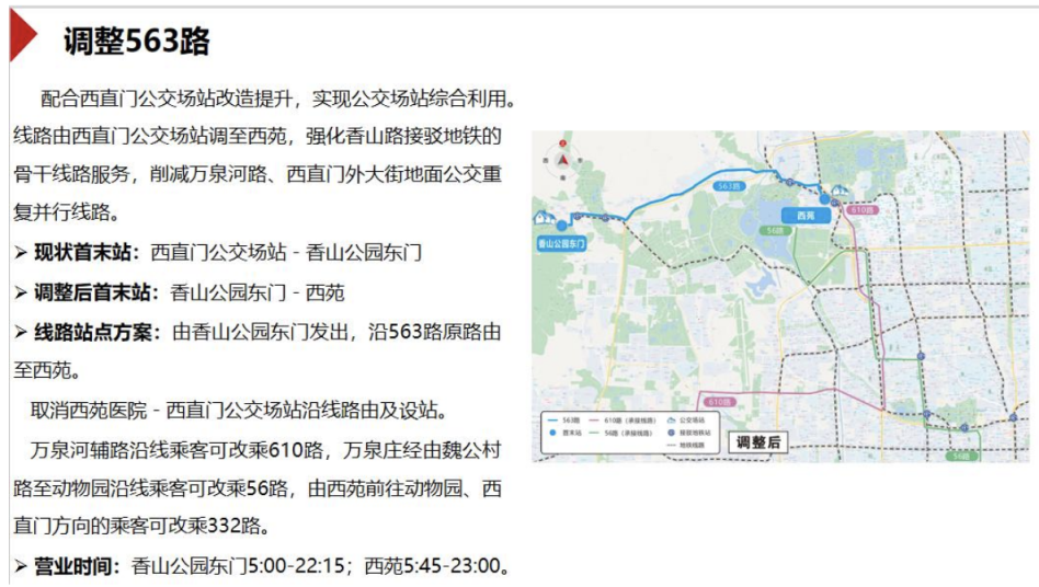 此次调整中,配合西直门公交场站改造提升,实现公交场站综合利用,拟调整563路,线路由西直门公交场站调至西苑,强化香山路接驳地铁的骨干线路服务,削减万泉河路、西直门外大街地面公交重复并行线路。万泉河辅路沿线乘客可改乘610路,万泉庄经由魏公村路至动物园沿线乘客可改乘56路,由西苑前往动物园、西直门方向的乘客可改乘332路。