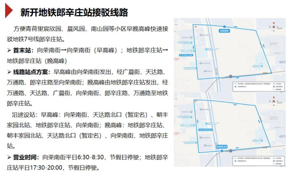 根据调整方案,拟新开地铁郎辛庄站接驳线路,方便青荷里宸欣园、晨风园、南山园等小区居民早晚高峰快速接驳地铁7号线郎辛庄站。线路早高峰由向荣南街发出,经广晨街、天达路、万通路、郎辛庄路至向荣南街;晚高峰由地铁郎辛庄站发出,经万通路、天达路、广晨街、向荣南街、郎辛庄路、万通路至地铁郎辛庄站。