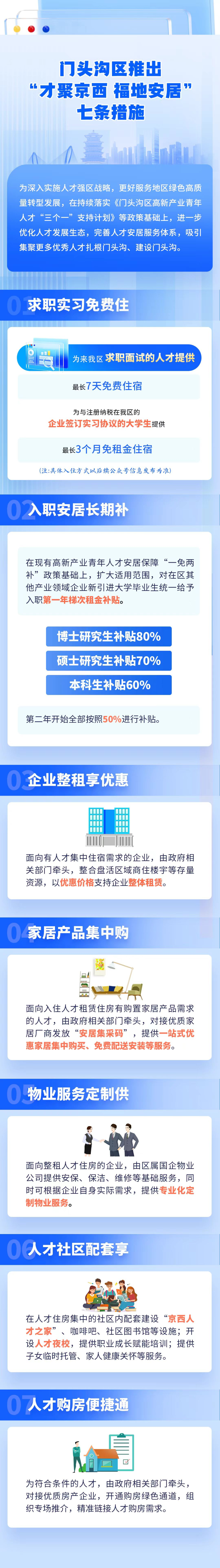 求职实习免费住:来门头沟区求职面试人才可享最长7天免费住宿,与区注册纳税企业签实习协议的大学生,可享最长3个月免租金住宿,具体入住方式以“北京门头沟”公众号后续发布为准。