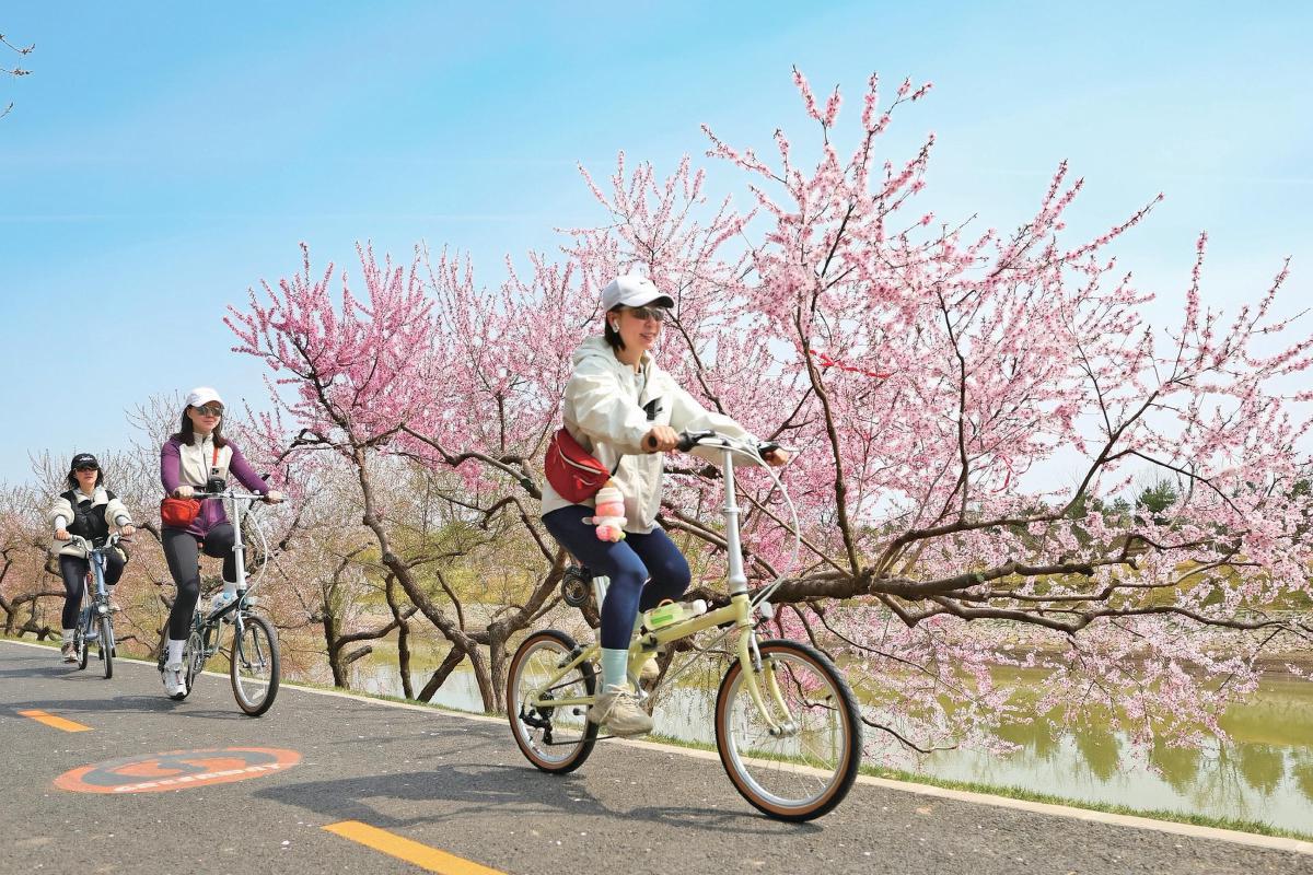 场景:两岸春花盛开,吸引不少骑行爱好者前来踏青骑行。