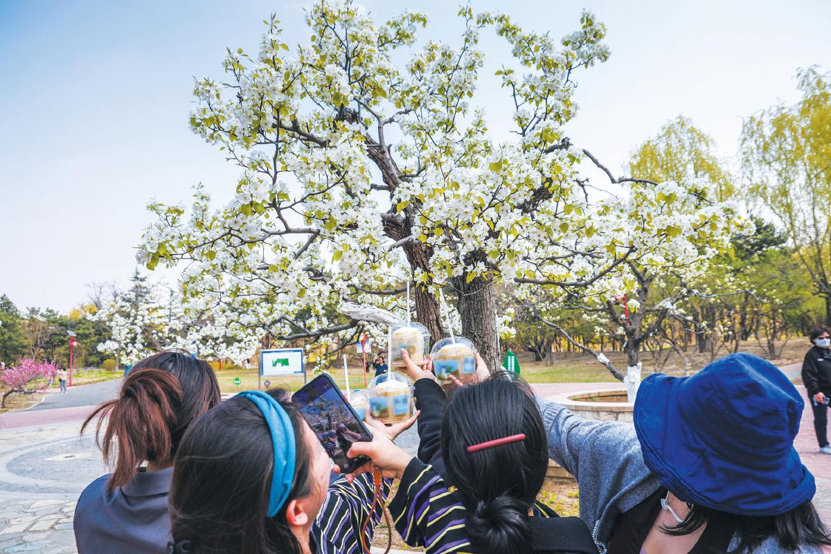 3月31日,京城梨园梨花广场,6株古梨树迎来盛花期,游客们手持饮品,在繁花下合影留念。6株古梨树有酸梨和雪花梨两个品种,每年春天,满树花开,十分壮丽,是京城梨园的标志景观。 新京报记者 王远征 摄影报道