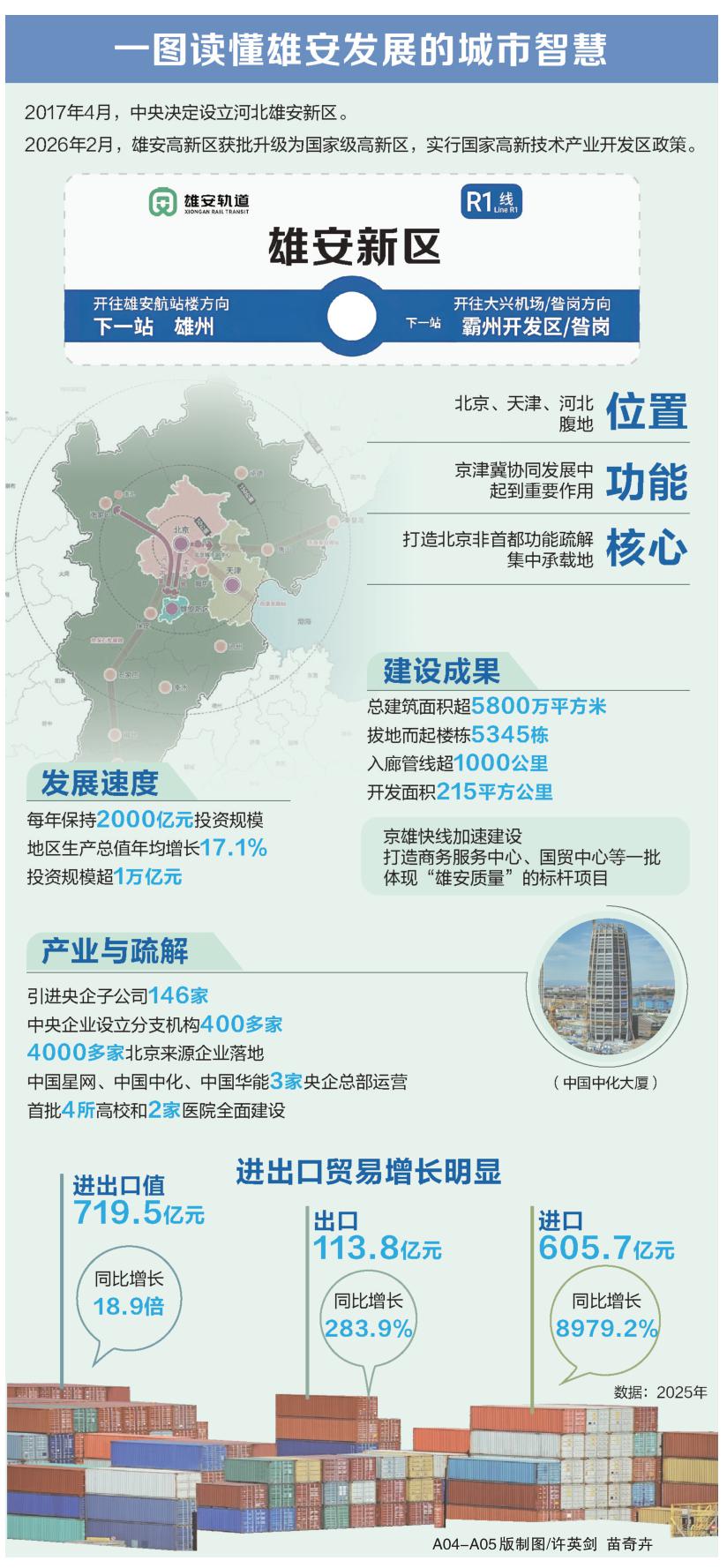 九载耕耘,雄安新区完成投资超过1万亿元,开发面积覆盖约215平方公里,5300余栋楼宇鳞次栉比,主要经济指标保持高速增长。这座“未来之城”正以愈发清晰的轮廓,向世界展示中国式现代化城市建设的生动实践。