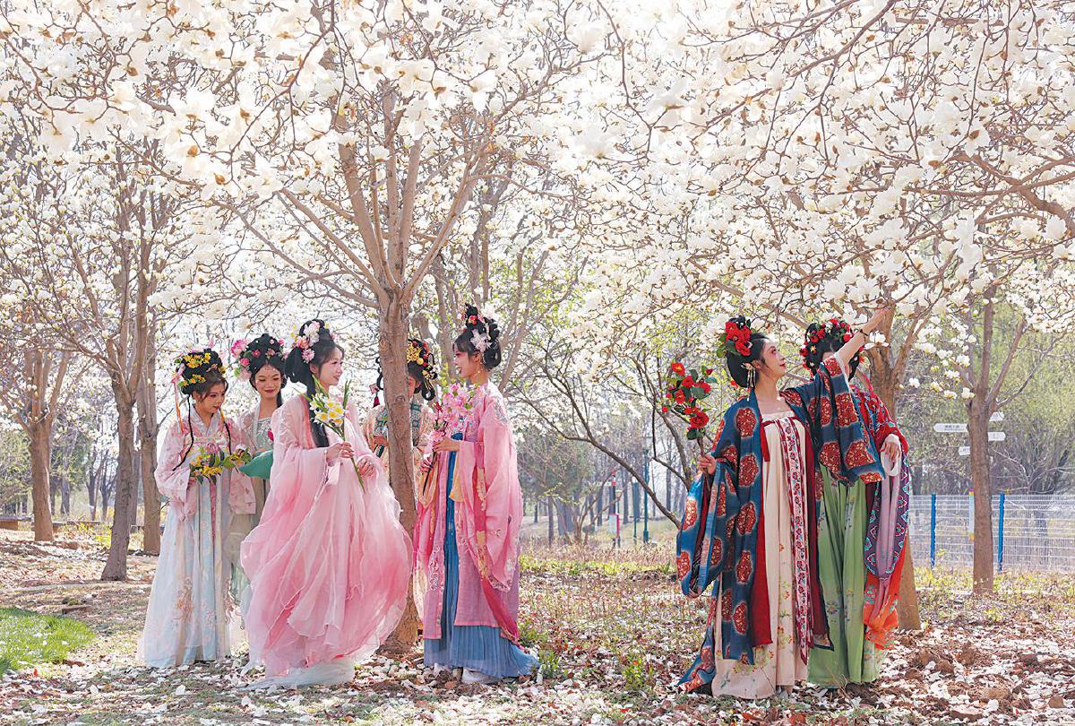 场景:扮演花神的女生漫步玉兰花间。新京报记者 李木易 摄