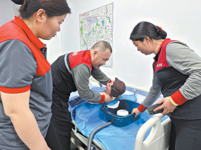 位于南三环的京东家政北京培训中心,每周都会举行养老护理培训班。和普通的家政培训相比,“家政+养老”的培训时间更长,考核也更加严格。“普通家政培训只有3天,‘家政+养老’培训是5天。”才识介绍,在5天的培训中,其中3天都是养老方面的内容,包括老年人日常生活照料、助浴、生命体征监测,以及应急情况处理等。剩下的两天,除了一天培训保洁等家政技能外,还有一天是学习陪诊方面的内容。