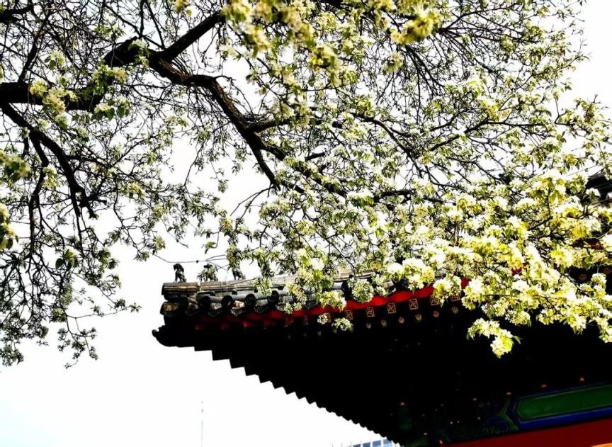 春日里,雪白的梨花密密匝匝爬满枝头,在古刹的静谧氛围中更显清雅。今年入春以来,网上每日打卡播报智化寺梨花开放情况的帖子接连不断,梨花盛花期一至,便迎来了打卡热潮。每周二至周日,上午、下午各一场的京音乐演出在智化殿前奏响,乐声绕梁,花香袭人,氛围感拉满。