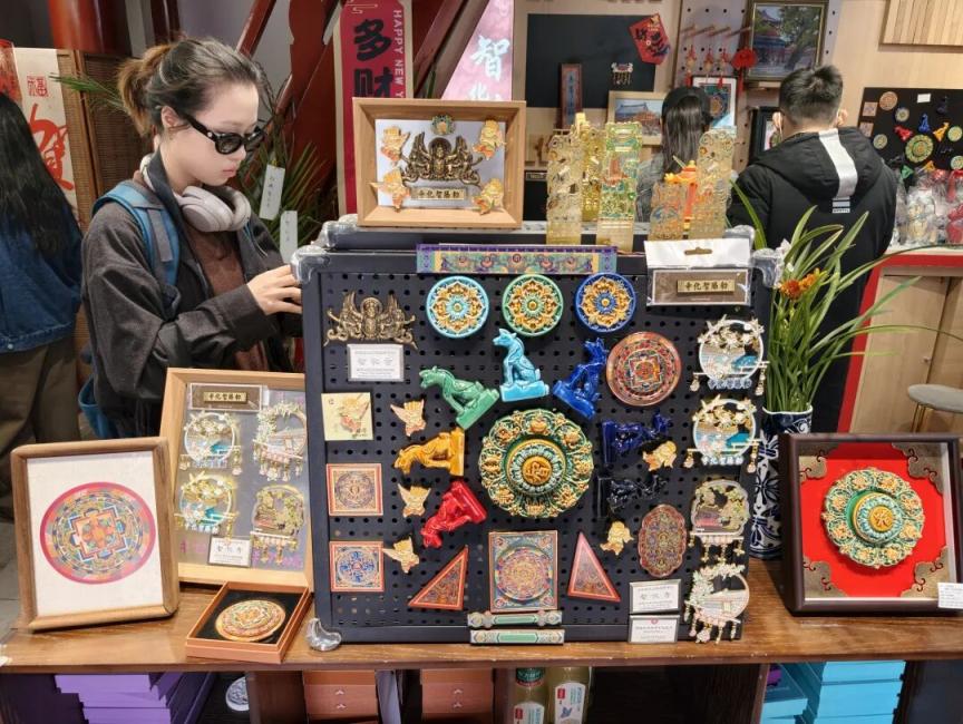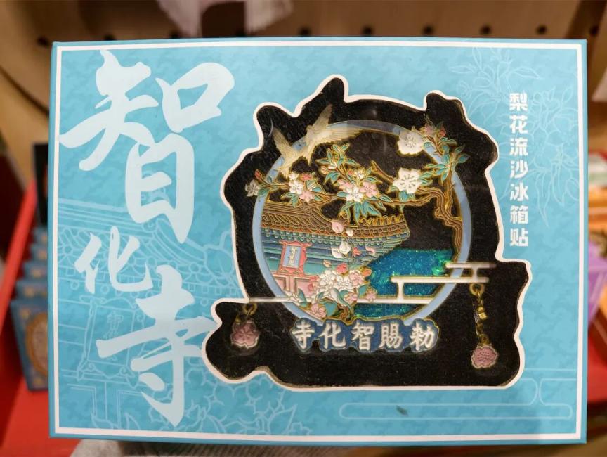 寺内鼓楼一层的“智化寺文创空间”里,好物更是琳琅满目。藏殿藻井旋转冰箱贴、天花彩画旋转冰箱贴各具特色,而“梨花流沙冰箱贴”更是将智化寺梨花映古建的美景定格,让游客能把春日美好带回家。