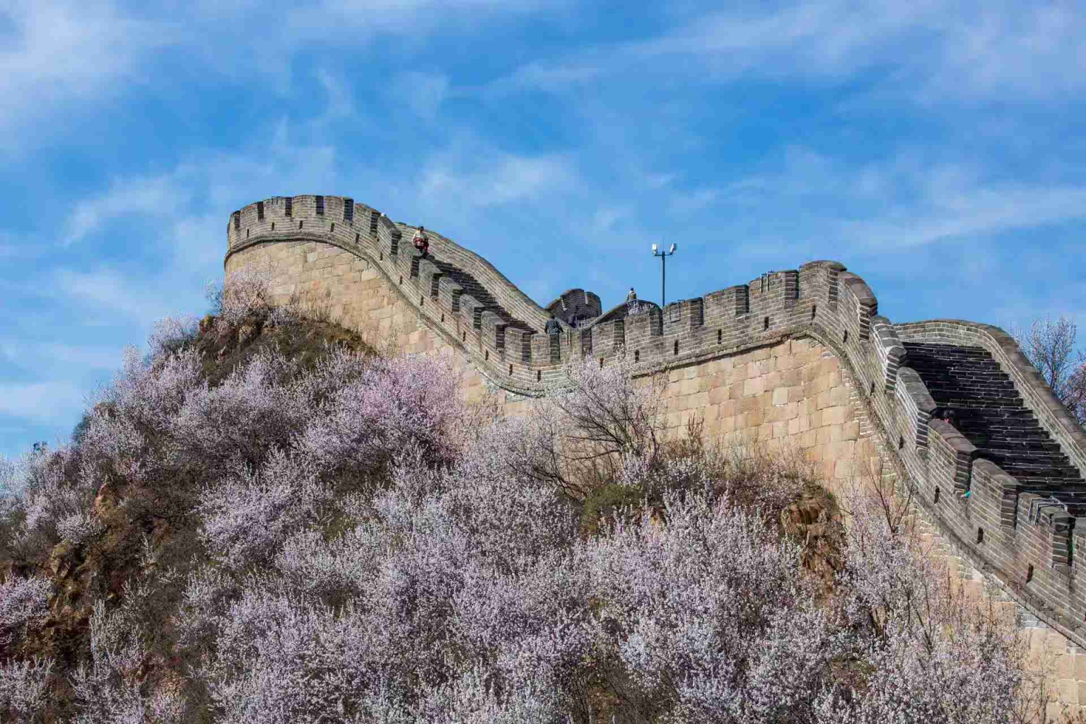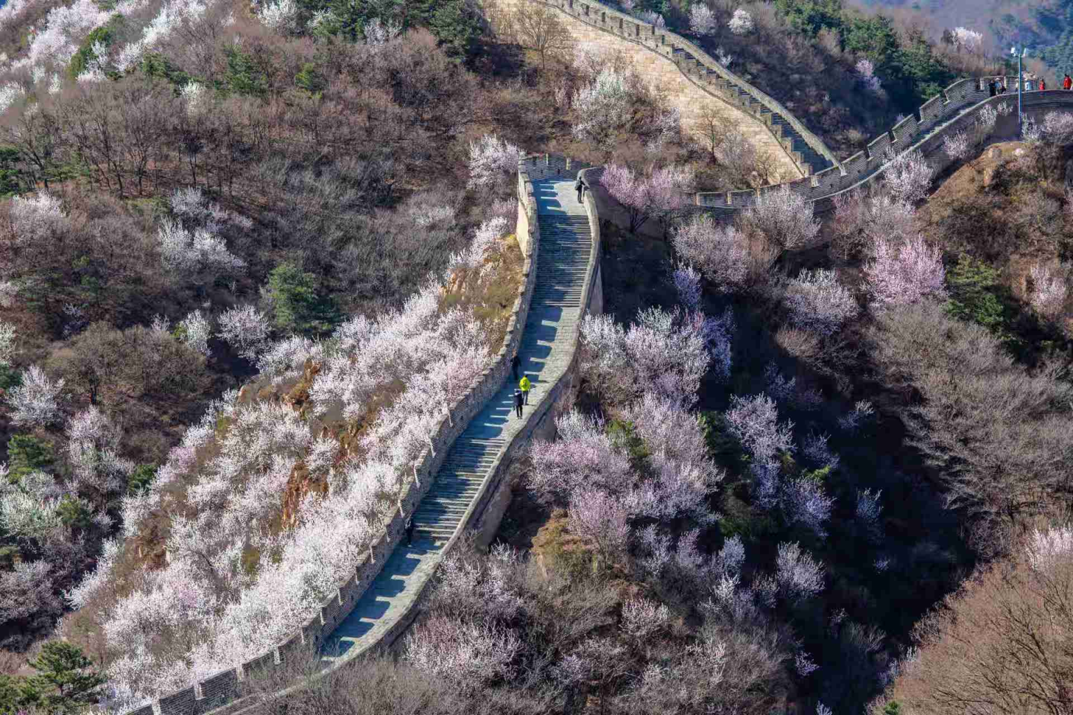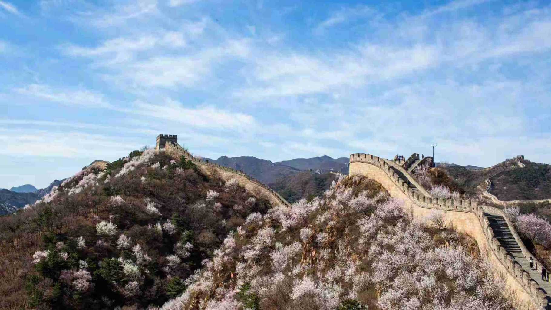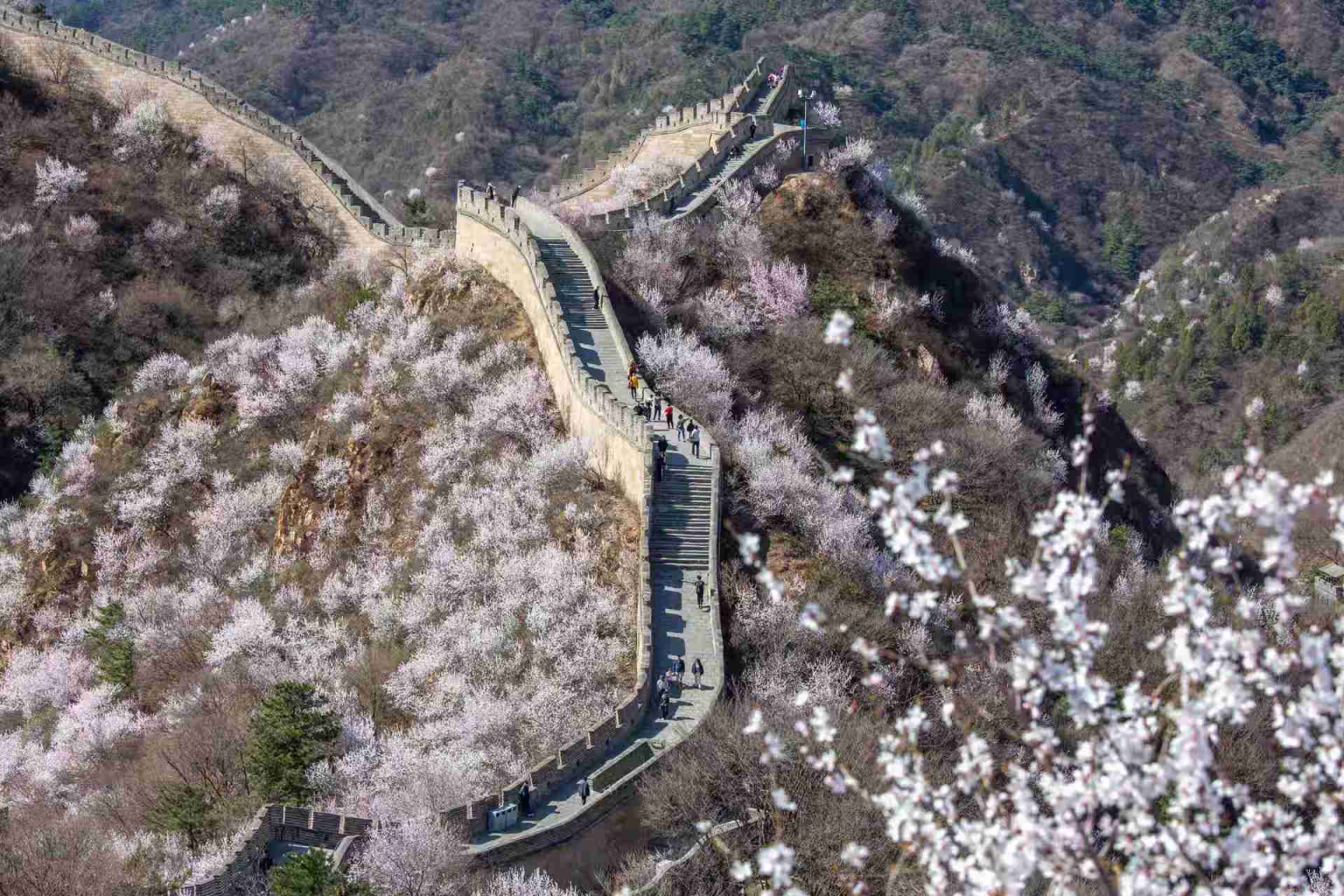 八达岭长城山花绽放,景色如画。