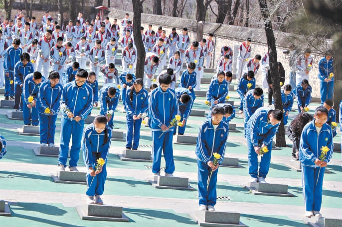 学生们参加烈士安葬仪式,并向陵园里的烈士献花。 本报记者 白继开摄